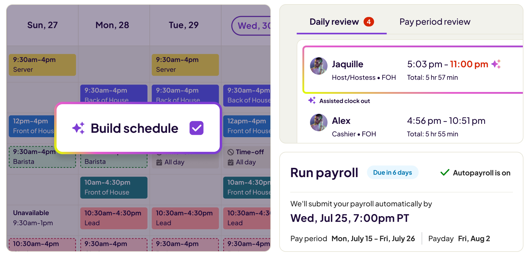Save even more time with AI-powered Assistants to help you hire, schedule, onboard, and run payroll by taking the hardest, most tedious work off your plate.