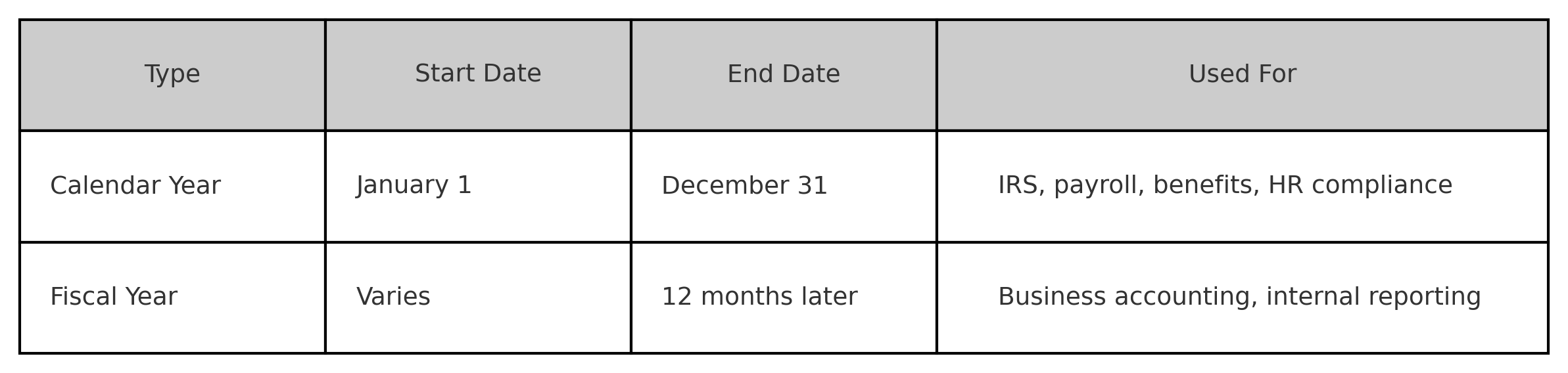 A calendar year is the 12-month period that starts on January 1 and ends on December 31. It is the standard year used for most legal, financial, and administrative purposes in the U.S., including IRS reporting, payroll cycles, employee benefits, and business planning.