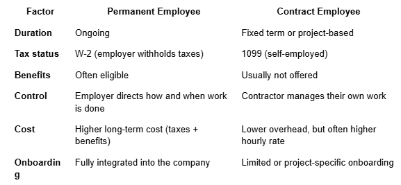 - Team culture: Permanent employees contribute more to morale, mentorship, and shared goals