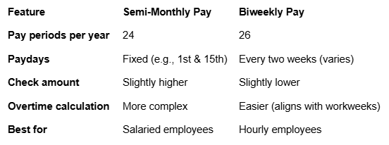 Many employers debate whether semi-monthly or biweekly pay is the better option. Here’s how they compare: