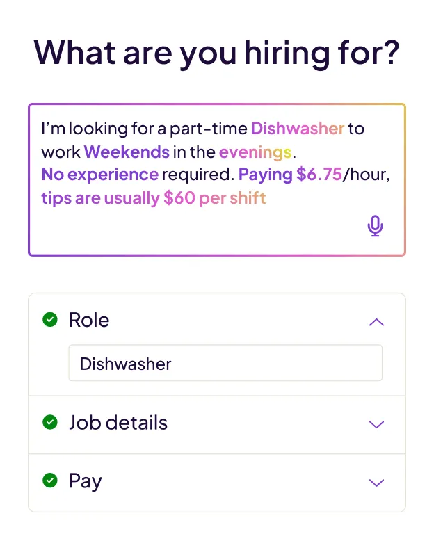 Share the basics and Hiring Assistant creates a polished job post and publishes it to top job boards in one click.