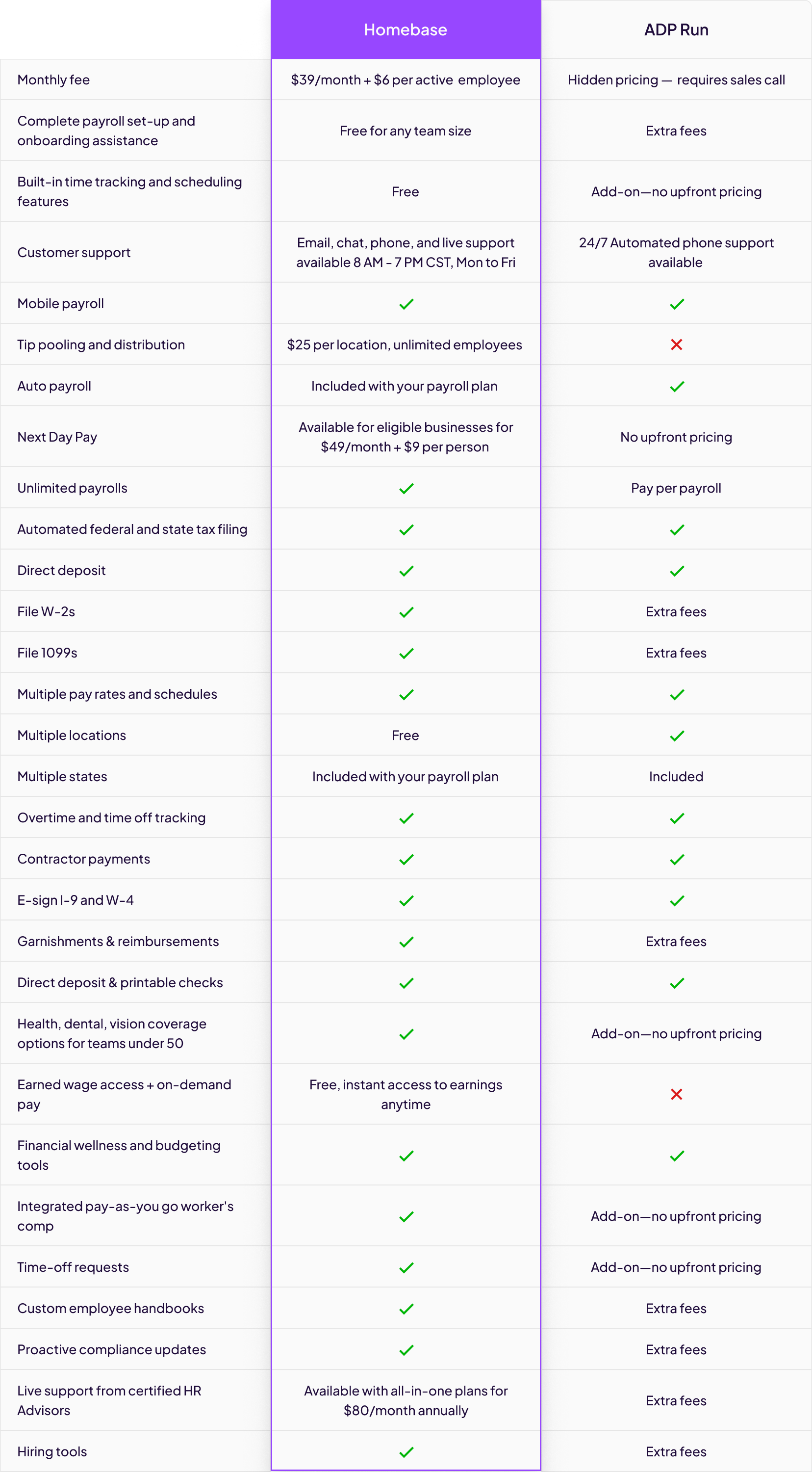 Breakdown: Homebase Payroll vs. ADP RUN Payroll